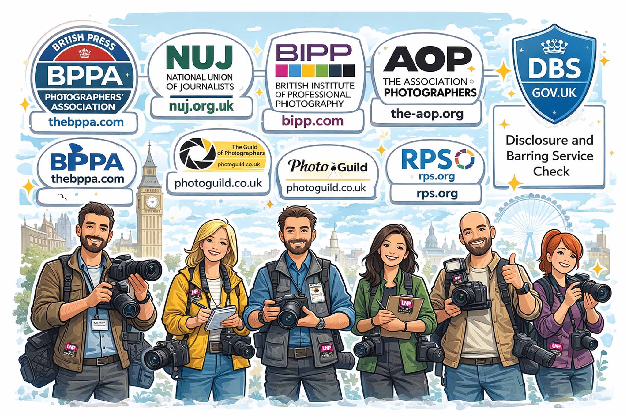 Many freelance photographers within the UNP network choose — entirely in their own capacity — to belong to recognised UK professional bodies, unions and institutes. These memberships are personal, voluntary and managed independently by each photographer.